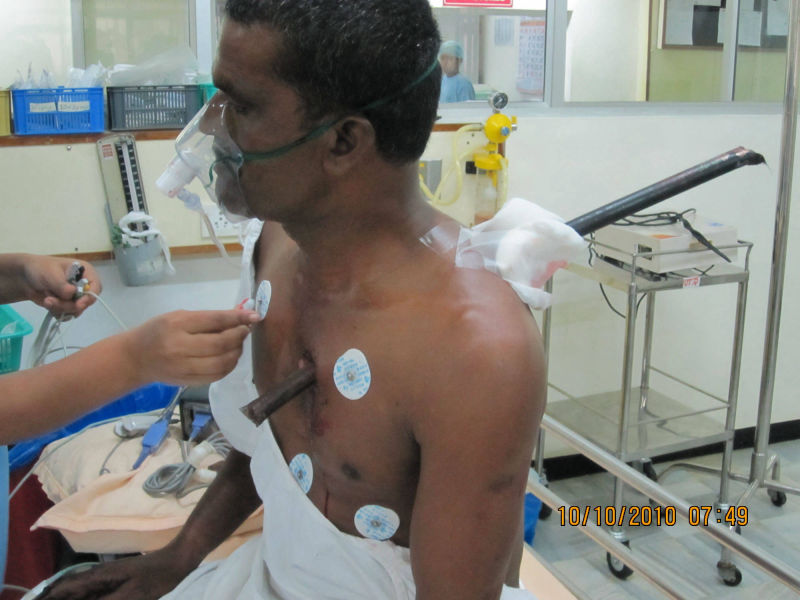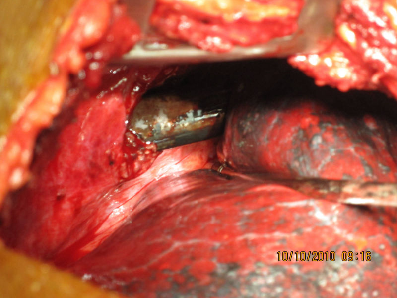 A bus traveller had his chest pierced with a protective iron rod along the window during an accident. He was brought to the hospital with the iron rod in-situ. The rod was removed through a thoracotomy and the lung was repaired.